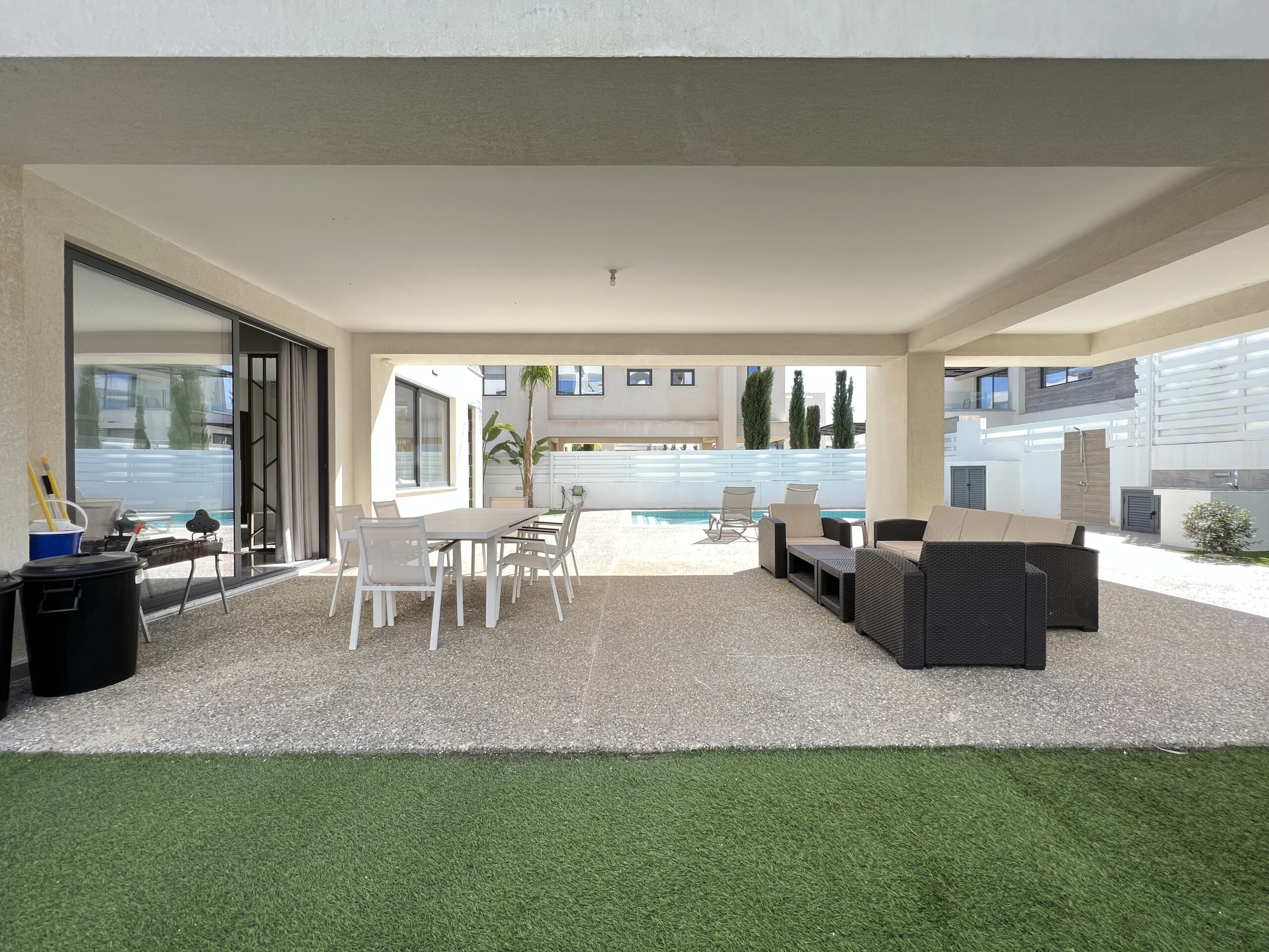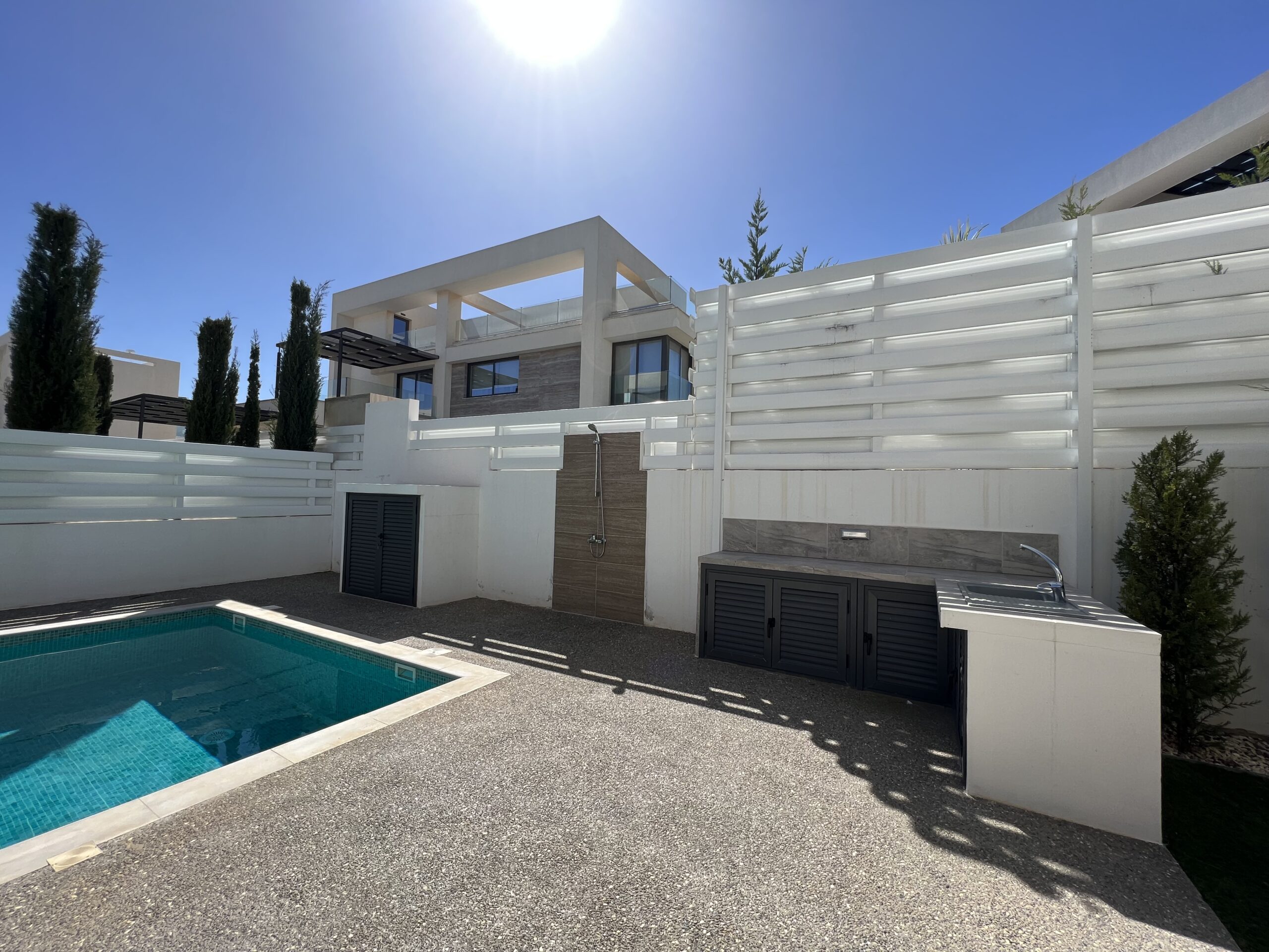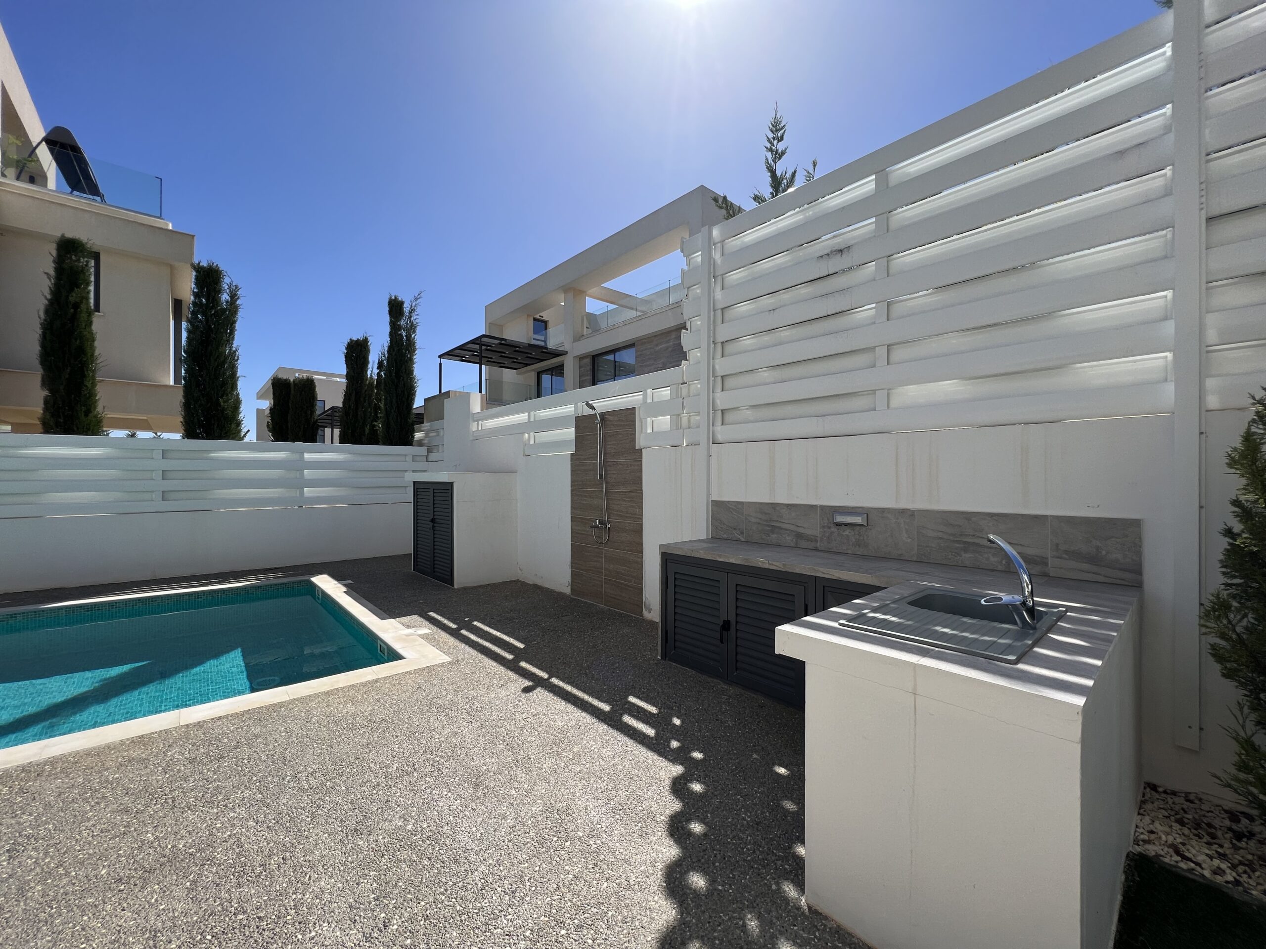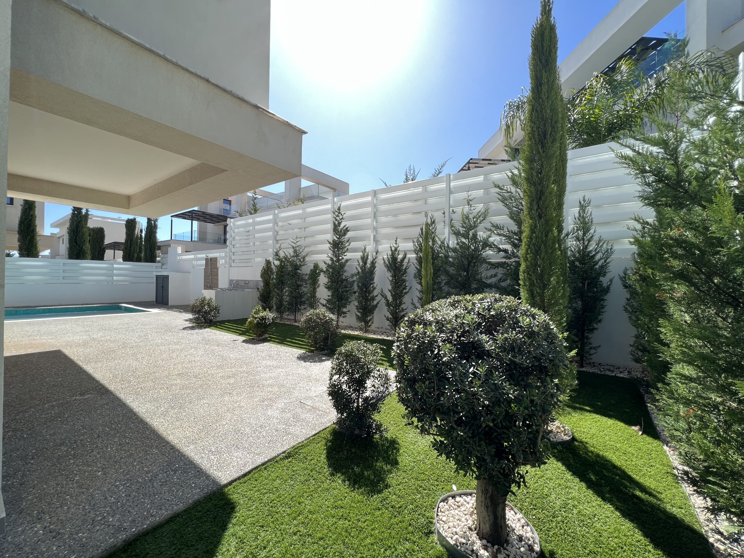Πωλείται εκπληκτική βίλα στην περιοχή Αγία Τριάδα, πολύ κοντά από τα απέραντα γαλάζια νερά του Πρωταρά Αμμοχώστου με 139 τ.μ. καλυμμένους εσωτερικούς χώρους, 61 τ.μ. καλυμμένη βεράντα και 68 τ.μ. κήπο οροφής σε 444 τ.μ. οικόπεδο χτισμένη το 2022. Το ισόγειο αποτελείται από ενιαίο χώρο τραπεζαρίας και κουζίνας, ξεχωριστό καθιστικό και μια τουλέτα επισκεπτών. Ο πρώτος όροφος αποτελείται από τρία υπνοδωμάτια και δύο χώρους υγιεινής εκ των οποίων en-suite στο κυρίως υπνοδωμάτιο και ένα κοινό μπάνιο. Εξωτερικά υπάρχει αυλή, χώρος στάθμευσης, μικρός κήπος, εξωτερικό ντούζ, πάγκος για μπάρμπεκιου με βρύση στην αυλή αλλά και στον κήπο οροφής, πλακόστρωτη καλυμμένη και ακάλυπτη αυλή και ιδιωτική πισίνα. Επιπλέον η έπαυλη διαθέτει blinds στα παράθυρα και κλιματιστικά σε όλους τους χώρους. Αυτό το εξαιρετικό διώροφο ακίνητο βρίσκεται κοντά από την παραλία, είναι κοντά σε χώρο πράσινου, 2km από τον Πρωταρά και με εύκολη πρόσβαση σε όλες τις υπηρεσίες. Τιμή πώλησης 630,000 ευρώ. Δεν υπόκειται σε Φ.Π.Α.