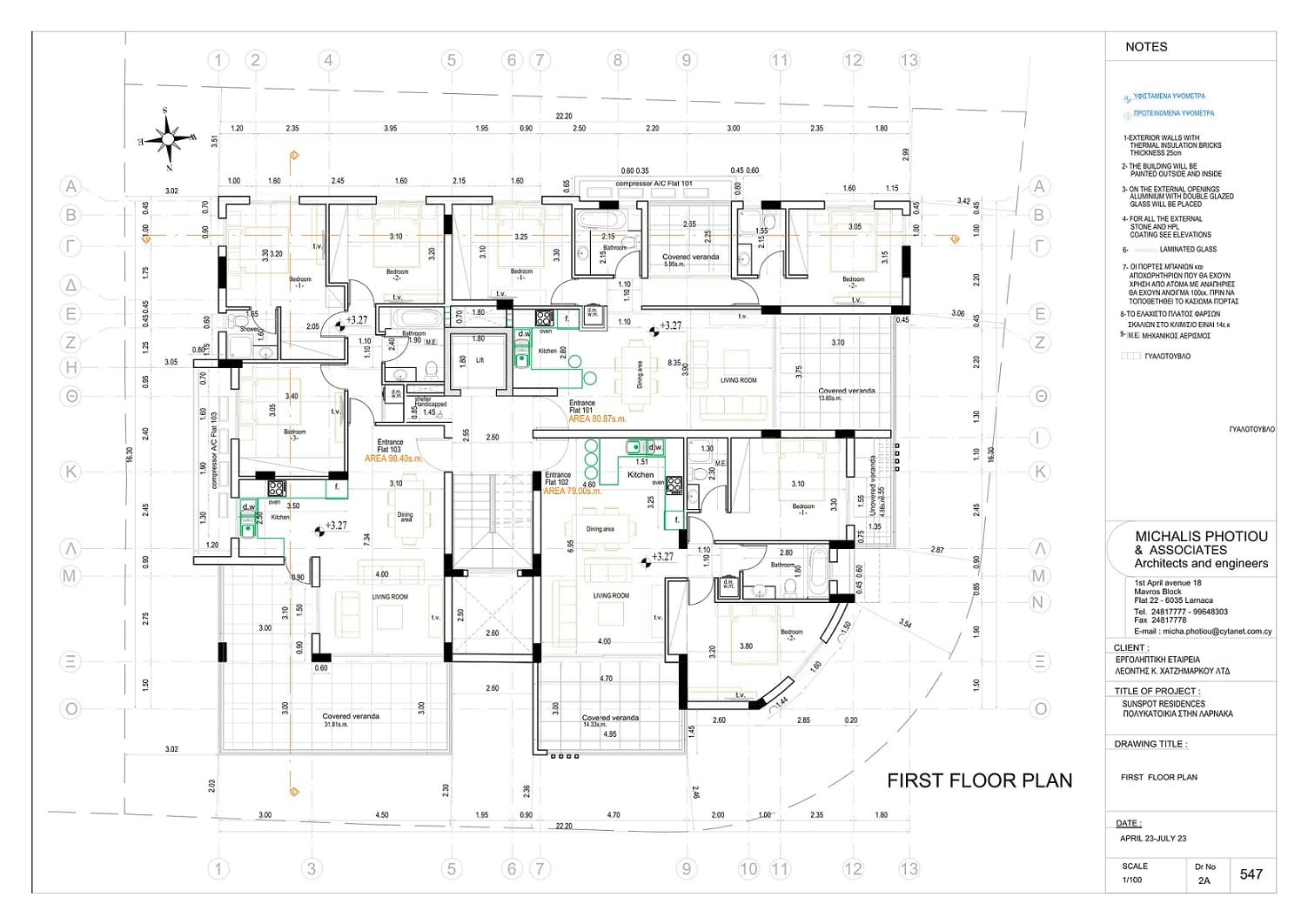 Πωλείται υπό ανέγερση ρετιρέ διαμέρισμα δύο υπνοδωματίων στην επαρχία Λάρνακας, στον 3ο όροφο τριώροφης μοντέρνας πολυκατοικίας με 9 διαμερίσματα στο σύνολο, με 79 τ.μ. εσωτερικό καλυμμένο χώρο, 14 τ.μ. καλυμμένη βεράντα και 26 τ.μ. κήπο οροφής. Το διαμέρισμα διαθέτει πρόνοιες για συστήματα κλιματισμού σε όλους τους χώρους, en-suite στο κυρίως υπνοδωμάτιο, πιεστικό σύστημα νερού, ηλιακό θερμοσίφωνα, καλυμμένο χώρο στάθμευσης και αποθήκη. Επιπλέον να σημειωθεί ότι το έργο είναι ενεργειακή απόδοση Α+ με υψηλή ποιότητα κατασκεύης. Η πολυκατοικία βρίσκεται σε προνομιούχα περιοχή της Λάρνακας σε μικρή απόσταση από υπεραγορές, σχολεία και άλλες υπηρεσίες. Τιμή πώλησης του διαμερίσματος 255,000 ευρώ πλέον Φ.Π.Α.
