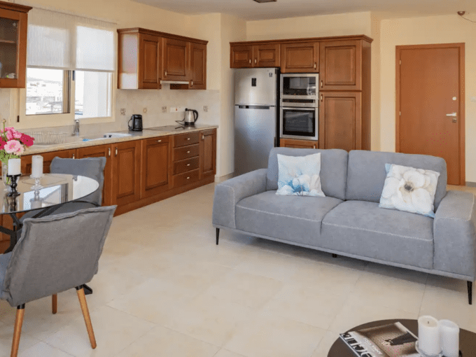 Πωλείται υπό ανέγερση διαμέρισμα δύο υπνοδωματίων στην περιοχή Γερμασόγειας στην επαρχία Λεμεσού. Αποτελείται από 90 τ.μ. καλυμμένο εσωτερικό χώρο, 25 τ.μ. καλυμμένες βεράντες και 3 τ.μ. ακάλυπτη βεράντα. Διαθέτει 2 χώρους υγιεινής, εκ των οποίων en-suite στο κυρίως υπνοδωμάτιο, καλυμμένο χώρο στάθμευσης και αποθήκη, εγκατεστημένα συστήματα κλιματισμού θέρμανσης και ψύξης και εγκατεστημένη υποδαπέδια θέρμανση συνδεδεμένη με εξωτερική μονάδα αντλίας θερμότητας (heat pump). Επιπλέον διαθέτει εντοιχισμένες ηλεκτρικές συσκευές στην κουζίνα, ηλεκτρικό θερμοσίφωνα και πιεστικό σύστημα νερού, φωτοβολταϊκά πάνελ στην οροφή για εξυπηρέτηση των αναγκών του διαμερίσματος, πρόνοιες για σύστημα συναγερμού ασφαλείας και φόρτιση ηλεκτρικού αυτοκινήτου και πόρτα εισόδου ελεγχόμενη με θυροτηλεόραση. Βρίσκεται στον δεύτερο όροφο τετραώροφης πολυκατοικίας με 16 διαμερίσματα στο σύνολο. Το διαμέρισμα είναι ευρύχωρο, με μοντέρνο σχεδιασμό και Ενεργειακής Απόδοσης Α’. Οι αγοραστές θα έχουν δικαίωμα χρήσης στην κοινόχρηστη εξωτερική πισίνα του συγκροτήματος, στο εσωτερικό γυμναστήριο, σε γήπεδο πολλαπλών χρήσεων και στην παιδική χαρά. Βρίσκεται σε πολύ ωραία περιοχή, σε ύψωμα, κοντά σε υπηρεσίες και σχολεία, με ωραία θέα τη θάλασσα και την πόλη. Τιμή πώλησης 400,000 ευρώ πλέον Φ.Π.Α.